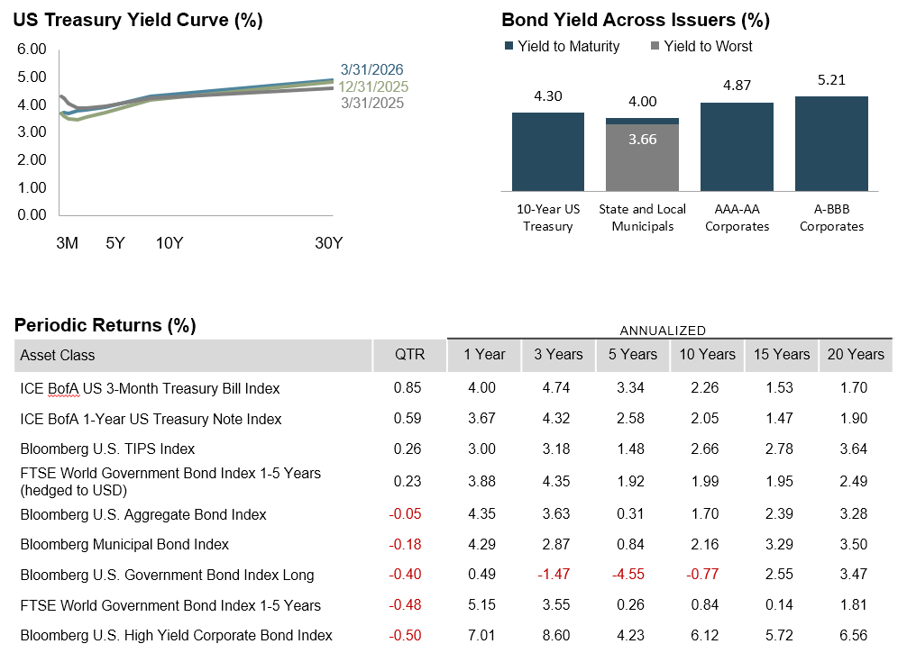 One basis point (bps) equals 0.01%. Past performance is not a guarantee of future results. Indices are not available for direct investment. Index performance does not reflect the expenses associated with the management of an actual portfolio. Yield curve data from Federal Reserve. State and local bonds, and the Yield to Worst are from the S&P National AMT-Free Municipal Bond Index. AAA-AA Corporates represent the ICE BofA US Corporates, AA-AAA rated. A-BBB Corporates represent the ICE BofA Corporates, BBB-A rated. Bloomberg data provided by Bloomberg. US long-term bonds, bills, inflation, and fixed income factor data © Stocks, Bonds, Bills, and Inflation (SBBI) Yearbook™, Ibbotson Associates, Chicago (annually updated work by Roger G. Ibbotson and Rex A. Sinquefield). FTSE fixed income indices © 2026 FTSE Fixed Income LLC, all rights reserved. ICE BofA index data © 2026 ICE Data Indices, LLC. S&P data © 2026 S&P Dow Jones Indices LLC, a division of S&P Global. All rights reserved.