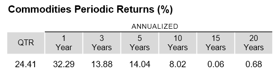 Past performance is not a guarantee of future results. Index is not available for direct investment. Index performance does not reflect the expenses associated with the management of an actual portfolio. Commodities returns represent the return of the Bloomberg Commodity Total Return Index. Individual commodities are sub-index values of the Bloomberg Commodity Total Return Index. Data provided by Bloomberg.