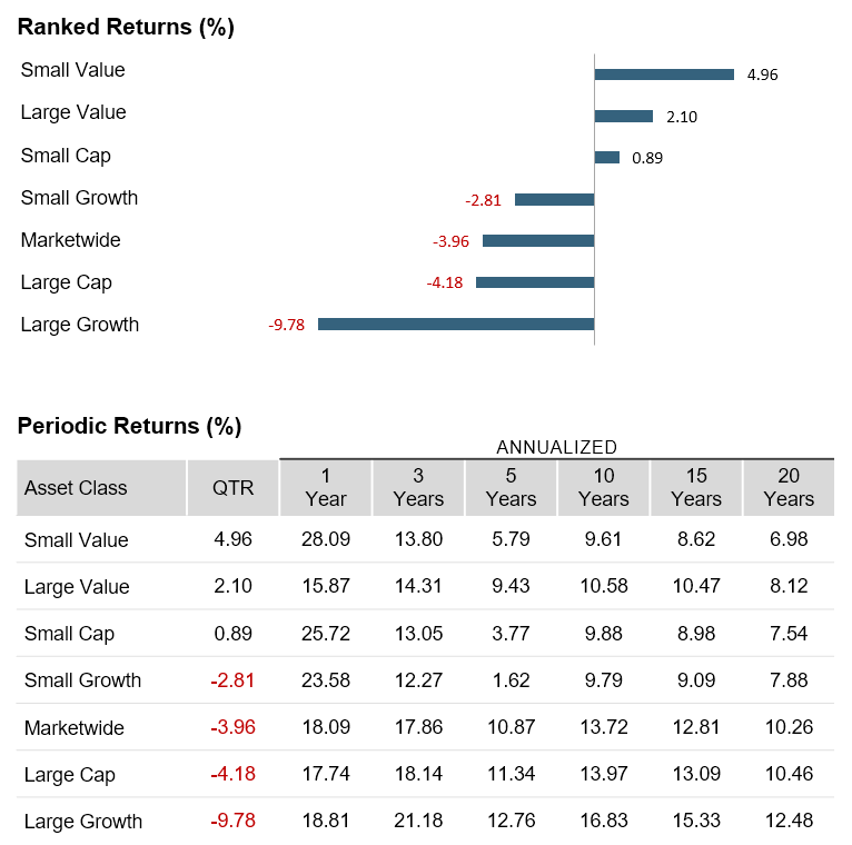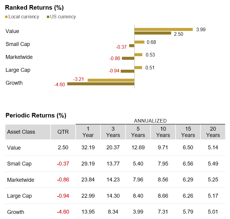 - The US equity market posted negative returns for the quarter and underperformed both non-US developed and emerging markets