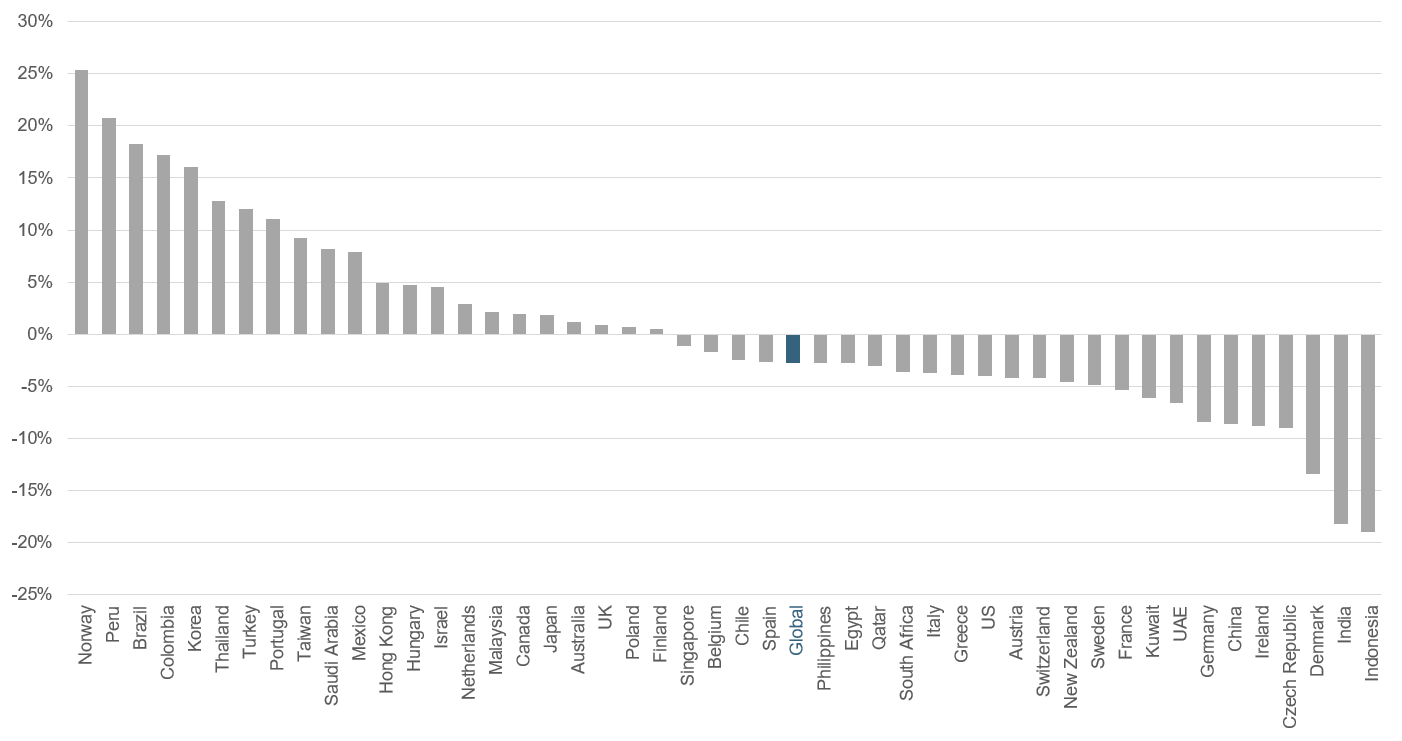 Country returns are the country component indices of the MSCI All Country World IMI Index for all countries except the United States, where the Russell 3000 Index is used instead. Global is the return of the MSCI All Country World IMI Index. MSCI index returns are net dividend. Indices are not available for direct investment. Their performance does not reflect the expenses associated with the management of an actual portfolio. Frank Russell Company is the source and owner of the trademarks, service marks and copyrights related to the Russell Indexes. MSCI data © MSCI 2026, all rights reserved.