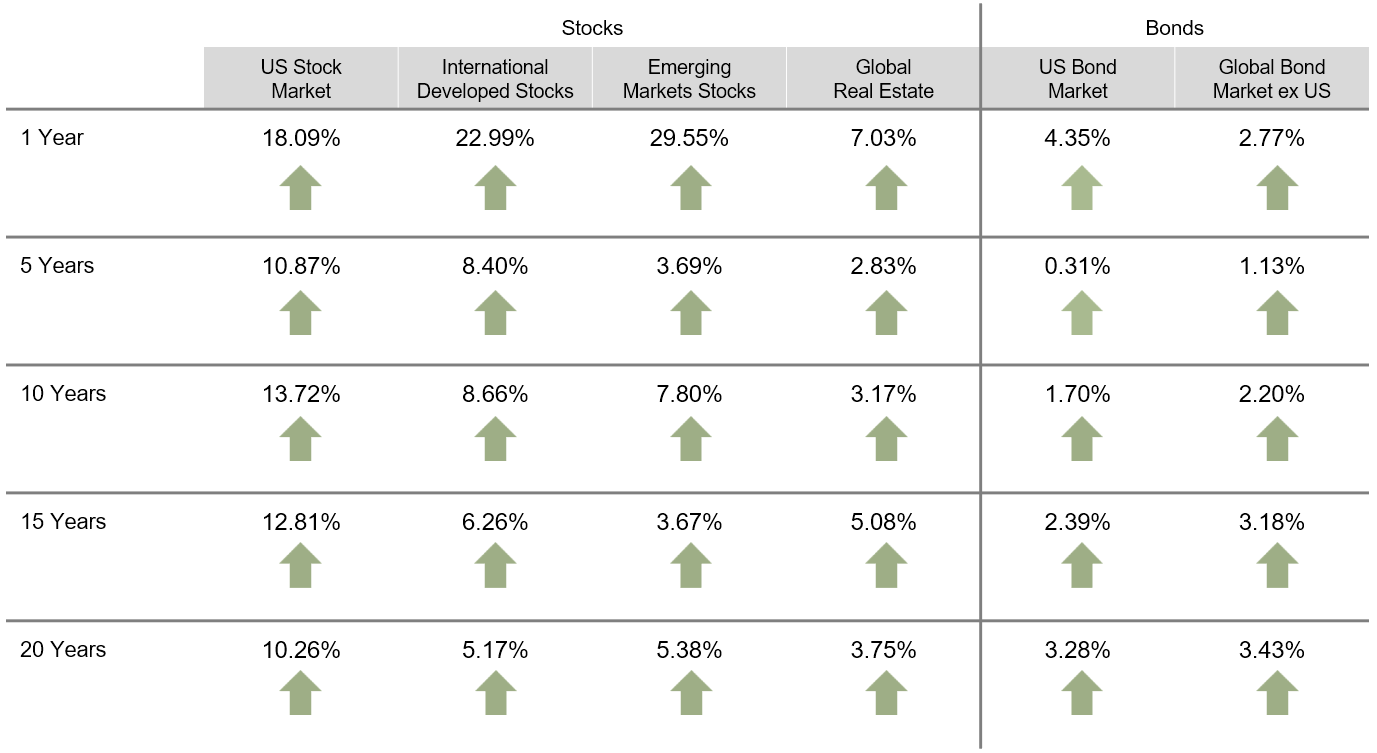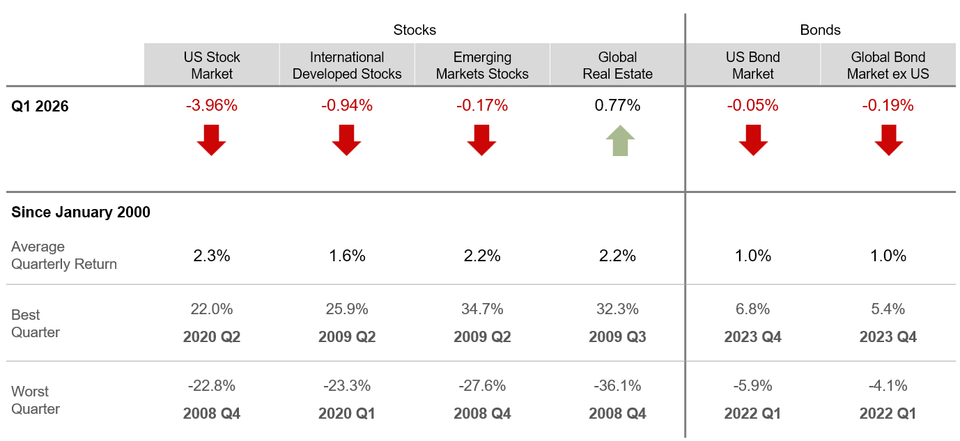 Market segment (index representation) as follows: US Stock Market (Russell 3000 Index), International Developed Stocks (MSCI World ex USA Index [net dividends]), Emerging Markets (MSCI Emerging Markets Index [net dividends]), Global Real Estate (S&P Global REIT Index [net dividends]), US Bond Market (Bloomberg US Aggregate Bond Index), and Global Bond Market ex US (Bloomberg Global Aggregate ex-USD Bond Index [hedged to USD]). S&P data © 2026 S&P Dow Jones Indices LLC, a division of S&P Global. All rights reserved. Frank Russell Company is the source and owner of the trademarks, service marks, and copyrights related to the Russell Indexes. MSCI data © MSCI 2026, all rights reserved. Bloomberg data provided by Bloomberg.