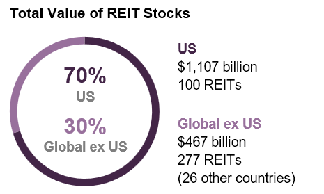 Past performance is not a guarantee of future results. Indices are not available for direct investment. Index performance does not reflect the expenses associated with the management of an actual portfolio. Number of REIT stocks and total value based on the two indices. All index returns are net of withholding tax on dividends. Total value of REIT stocks represented by Dow Jones US Select REIT Index and the S&P Global ex US REIT Index. Dow Jones US Select REIT Index used as proxy for the US market, and S&P Global ex US REIT Index used as proxy for the World ex US market. Dow Jones and S&P data © 2026 S&P Dow Jones Indices LLC, a division of S&P Global. All rights reserved.