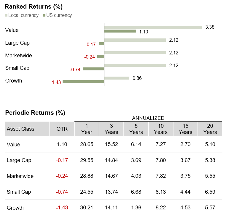 - Emerging Markets posted negative returns for the quarter and outperformed both US and non-US developed markets