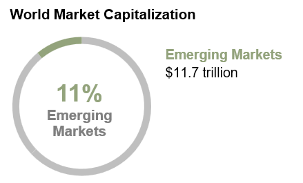 Past performance is not a guarantee of future results. Indices are not available for direct investment. Index performance does not reflect the expenses associated with the management of an actual portfolio. Market segment (index representation) as follows: Large Cap (MSCI Emerging Markets Index), Small Cap (MSCI Emerging Markets Small Cap Index), Value (MSCI Emerging Markets Value Index), and Growth (MSCI Emerging Markets Growth Index). All index returns are net of withholding tax on dividends. World Market Cap represented by Russell 3000 Index, MSCI World ex USA IMI Index, and MSCI Emerging Markets IMI Index. MSCI Emerging Markets IMI Index used as the proxy for the emerging market portion of the market. MSCI data © MSCI 2026, all rights reserved. Frank Russell Company is the source and owner of the trademarks, service marks, and copyrights related to the Russell Indexes.