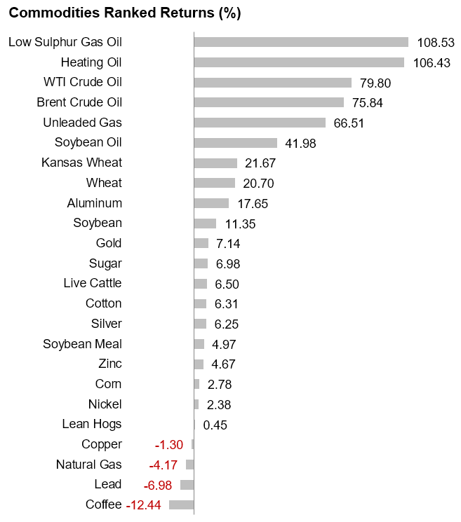 - Low Sulphur Gas Oil and Heating Oil were the best performers, returning +108.53% and +106.43% for the quarter, respectively. Coffee and Lead were the worst performers, returning -12.44% and -6.98% for the quarter, respectively