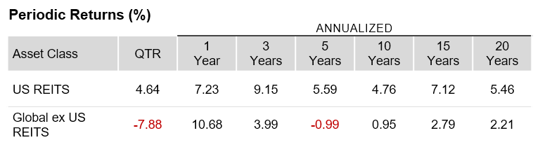 - US real estate investment trusts outperformed non-US REITs during the quarter
