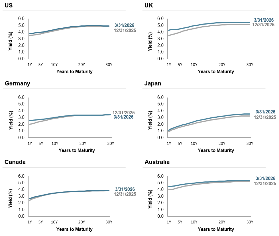 - In Canada, Germany, UK, Australia and Japan, the intermediate- to longer-term maturity range remained upwardly sloped. In Canada and Germany, the short-term maturity range steepened. However, in Australia and the UK, the short-term maturity segment flattened and inverted, respectively.