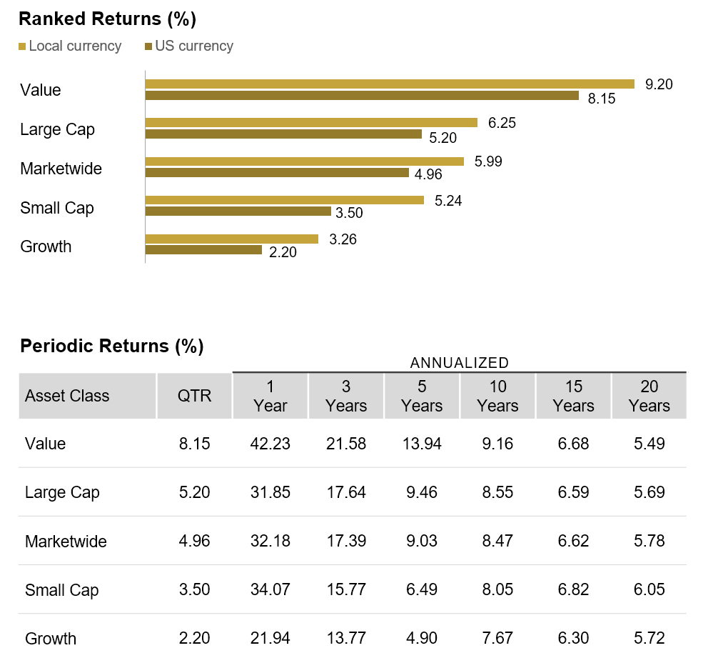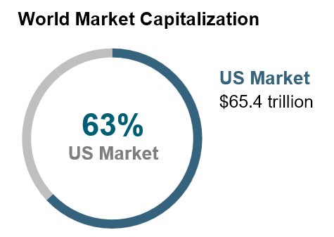 Market segment (index representation) as follows: Large Cap (MSCI World ex USA Index), Small Cap (MSCI World ex USA Small Cap Index), Value (MSCI World ex USA Value Index), and Growth (MSCI World ex USA Growth Index). All index returns are net of withholding tax on dividends. World Market Cap represented by Russell 3000 Index, MSCI World ex USA IMI Index, and MSCI Emerging Markets IMI Index. MSCI World ex USA IMI Index is used as the proxy for the International Developed market. MSCI data © MSCI 2025, all rights reserved. Frank Russell Company is the source and owner of the trademarks, service marks, and copyrights related to the Russell Indexes.