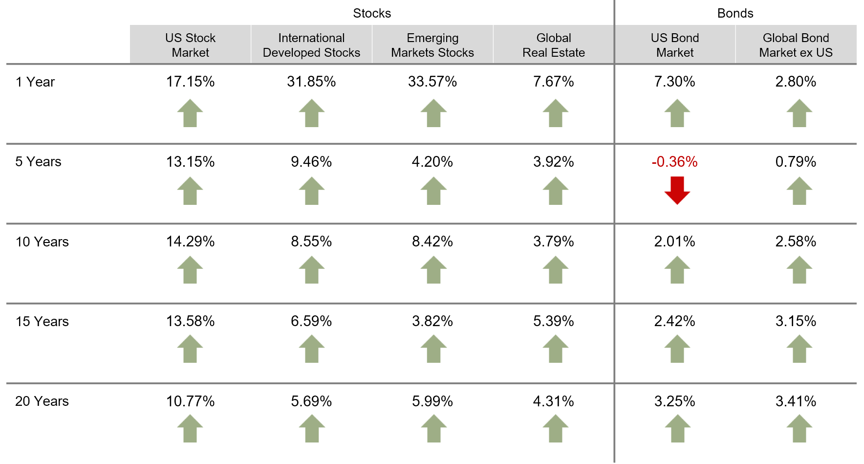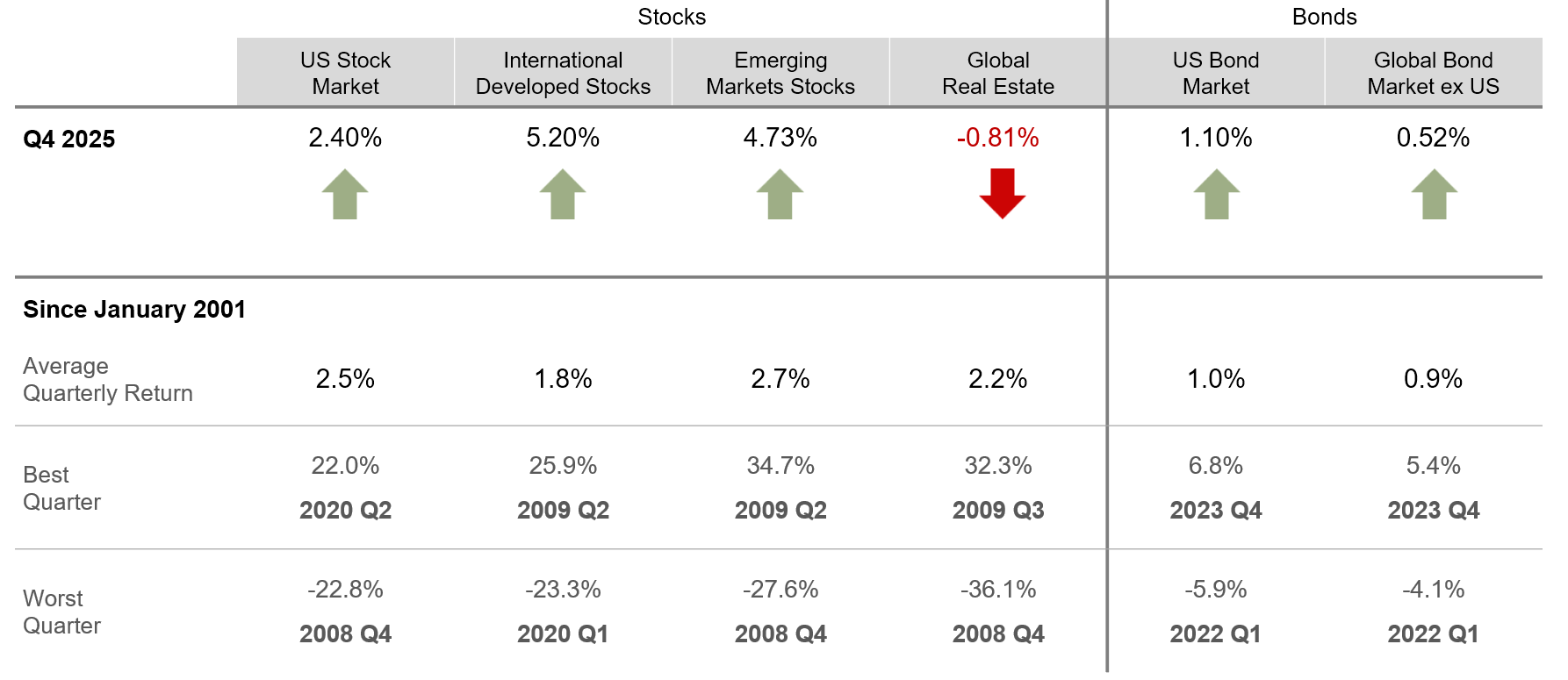 Market segment (index representation) as follows: US Stock Market (Russell 3000 Index), International Developed Stocks (MSCI World ex USA Index [net dividends]), Emerging Markets (MSCI Emerging Markets Index [net dividends]), Global Real Estate (S&P Global REIT Index [net dividends]), US Bond Market (Bloomberg US Aggregate Bond Index), and Global Bond Market ex US (Bloomberg Global Aggregate ex-USD Bond Index [hedged to USD]). S&P data © 2025 S&P Dow Jones Indices LLC, a division of S&P Global. All rights reserved. Frank Russell Company is the source and owner of the trademarks, service marks, and copyrights related to the Russell Indexes. MSCI data © MSCI 2025, all rights reserved. Bloomberg data provided by Bloomberg.