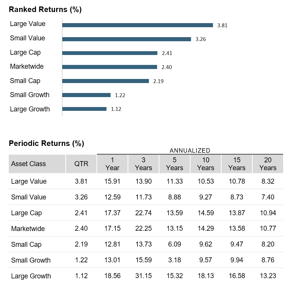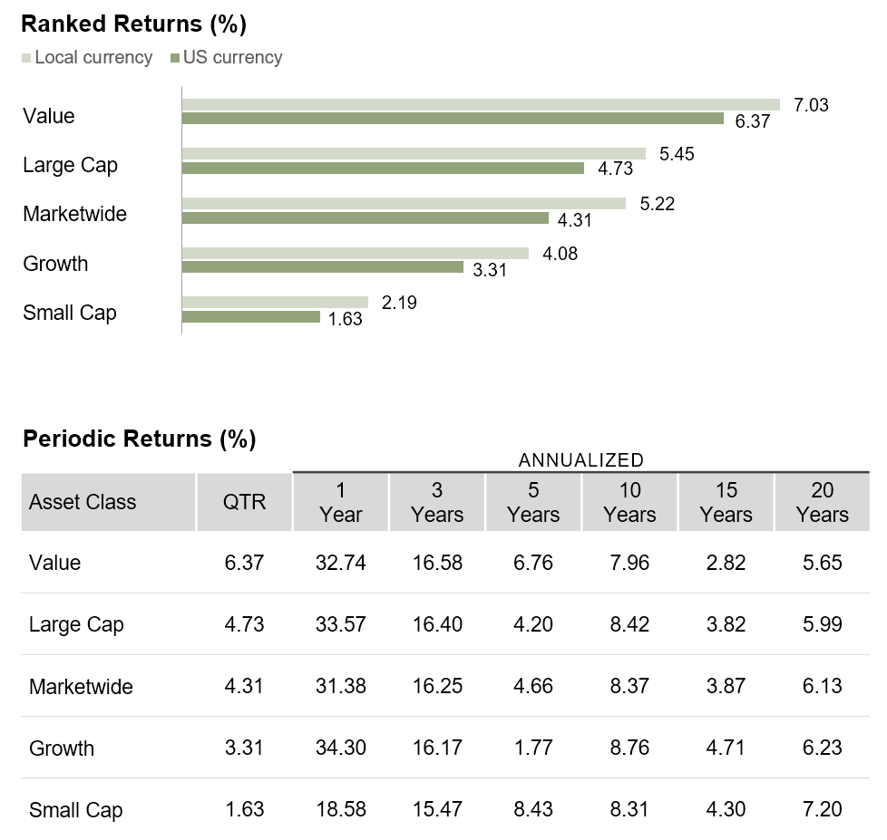 Past performance is not a guarantee of future results. Indices are not available for direct investment. Index performance does not reflect the expenses associated with the management of an actual portfolio. Market segment (index representation) as follows: Marketwide (Russell 3000 Index), Large Cap (Russell 1000 Index), Large Value (Russell 1000 Value Index), Large Growth (Russell 1000 Growth Index), Small Cap (Russell 2000 Index), Small Value (Russell 2000 Value Index), and Small Growth (Russell 2000 Growth Index). World Market Cap represented by Russell 3000 Index, MSCI World ex USA IMI Index, and MSCI Emerging Markets IMI Index. Russell 3000 Index is used as the proxy for the US market. Dow Jones US Select REIT Index used as proxy for the US REIT market. Frank Russell Company is the source and owner of the trademarks, service marks, and copyrights related to the Russell Indexes. MSCI data © MSCI 2025, all rights reserved.