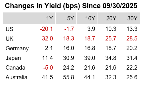 - In the UK, interest rates decreased across all maturity ranges. In the US, short-term interest rates decreased, and long-term interest rates increased. In Canada, Germany, UK and Australia, the short-term maturity range of their yield curves was generally flat but steepened in the three- to five-year maturity range.