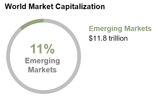 Past performance is not a guarantee of future results. Indices are not available for direct investment. Index performance does not reflect the expenses associated with the management of an actual portfolio. Market segment (index representation) as follows: Large Cap (MSCI Emerging Markets Index), Small Cap (MSCI Emerging Markets Small Cap Index), Value (MSCI Emerging Markets Value Index), and Growth (MSCI Emerging Markets Growth Index). All index returns are net of withholding tax on dividends. World Market Cap represented by Russell 3000 Index, MSCI World ex USA IMI Index, and MSCI Emerging Markets IMI Index. MSCI Emerging Markets IMI Index used as the proxy for the emerging market portion of the market. MSCI data © MSCI 2025, all rights reserved. Frank Russell Company is the source and owner of the trademarks, service marks, and copyrights related to the Russell Indexes.