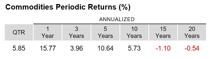 Past performance is not a guarantee of future results. Index is not available for direct investment. Index performance does not reflect the expenses associated with the management of an actual portfolio. Commodities returns represent the return of the Bloomberg Commodity Total Return Index. Individual commodities are sub-index values of the Bloomberg Commodity Total Return Index. Data provided by Bloomberg.