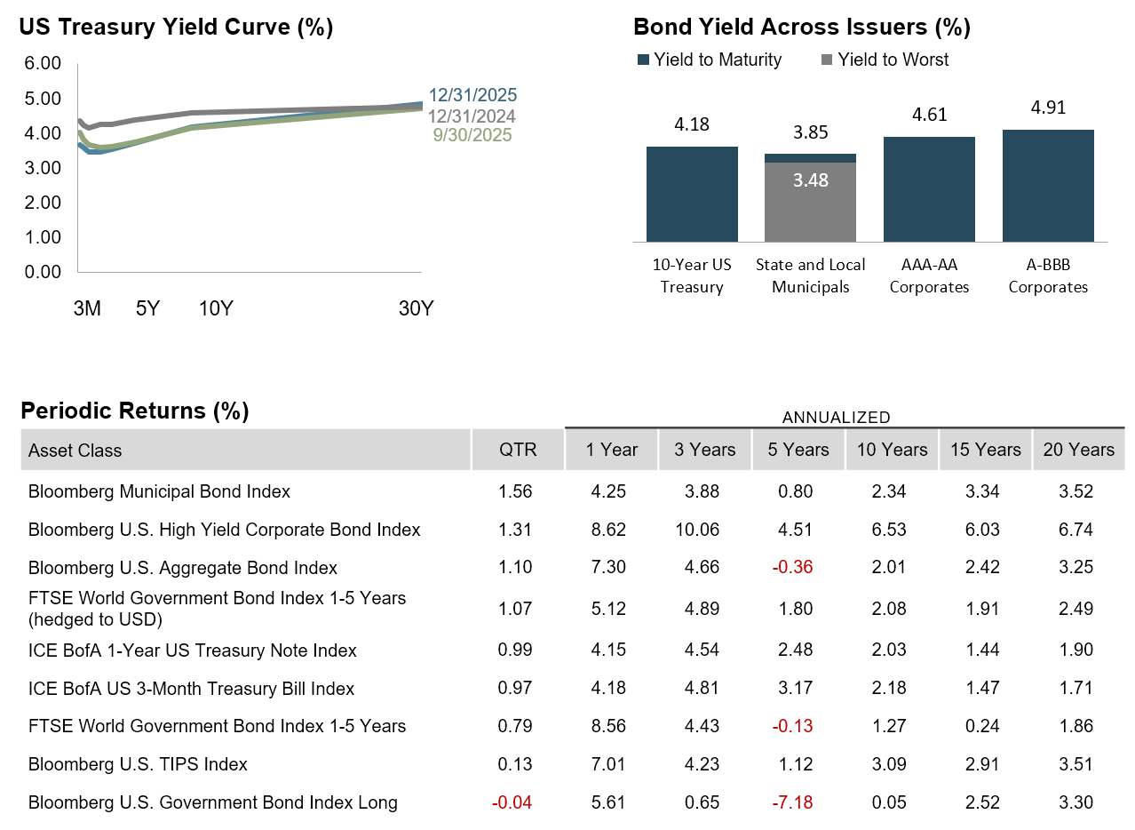 One basis point (bps) equals 0.01%. Past performance is not a guarantee of future results. Indices are not available for direct investment. Index performance does not reflect the expenses associated with the management of an actual portfolio. Yield curve data from Federal Reserve. State and local bonds, and the Yield to Worst are from the S&P National AMT-Free Municipal Bond Index. AAA-AA Corporates represent the ICE BofA US Corporates, AA-AAA rated. A-BBB Corporates represent the ICE BofA Corporates, BBB-A rated. Bloomberg data provided by Bloomberg. US long-term bonds, bills, inflation, and fixed income factor data © Stocks, Bonds, Bills, and Inflation (SBBI) Yearbook™, Ibbotson Associates, Chicago (annually updated work by Roger G. Ibbotson and Rex A. Sinquefield). FTSE fixed income indices © 2025 FTSE Fixed Income LLC, all rights reserved. ICE BofA index data © 2025 ICE Data Indices, LLC. S&P data © 2025 S&P Dow Jones Indices LLC, a division of S&P Global. All rights reserved.