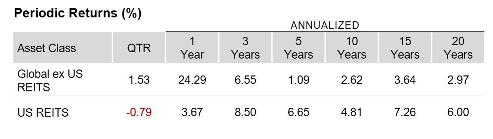 - US real estate investment trusts underperformed non-US REITs during the quarter