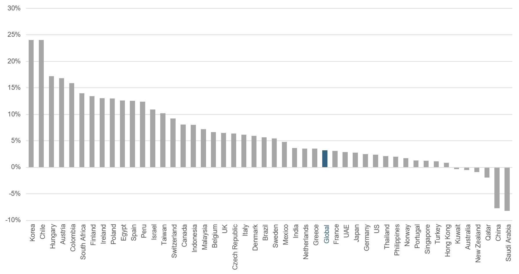 Country returns are the country component indices of the MSCI All Country World IMI Index for all countries except the United States, where the Russell 3000 Index is used instead. Global is the return of the MSCI All Country World IMI Index. MSCI index returns are net dividend. Indices are not available for direct investment. Their performance does not reflect the expenses associated with the management of an actual portfolio. Frank Russell Company is the source and owner of the trademarks, service marks and copyrights related to the Russell Indexes. MSCI data © MSCI 2025, all rights reserved.
