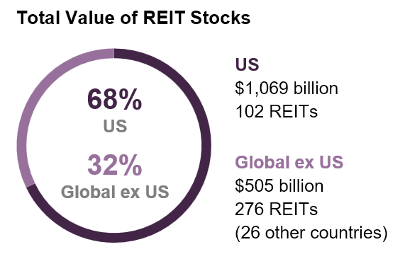 Past performance is not a guarantee of future results. Indices are not available for direct investment. Index performance does not reflect the expenses associated with the management of an actual portfolio. Number of REIT stocks and total value based on the two indices. All index returns are net of withholding tax on dividends. Total value of REIT stocks represented by Dow Jones US Select REIT Index and the S&P Global ex US REIT Index. Dow Jones US Select REIT Index used as proxy for the US market, and S&P Global ex US REIT Index used as proxy for the World ex US market. Dow Jones and S&P data © 2025 S&P Dow Jones Indices LLC, a division of S&P Global. All rights reserved.